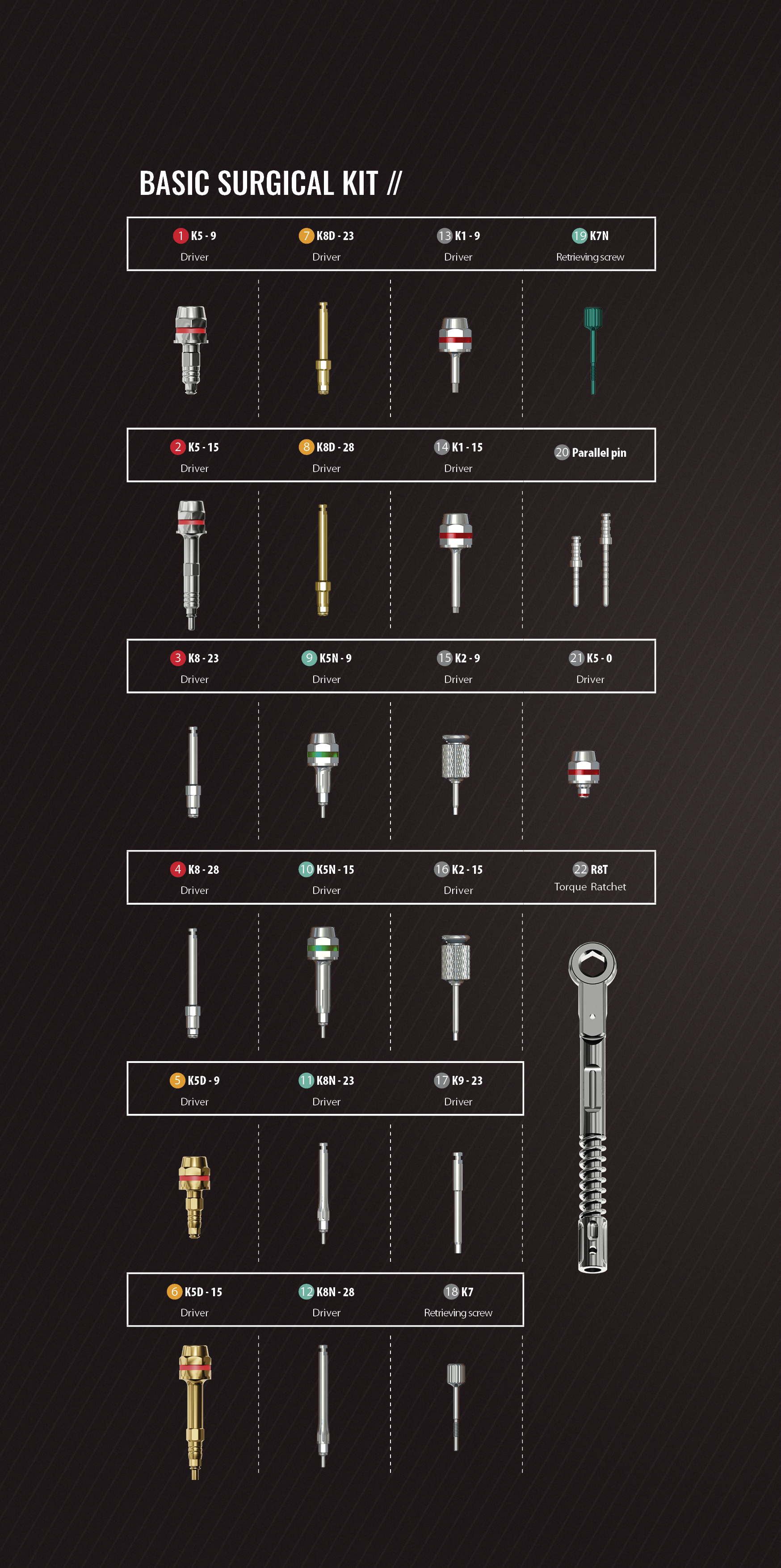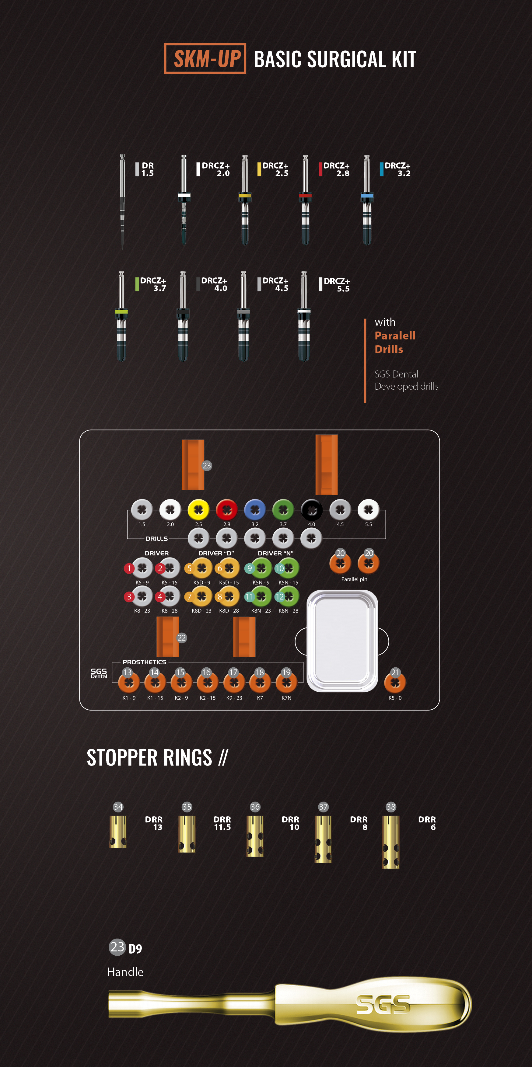The standard surgical kit with upgraded stopper drills and added DRR stoppers